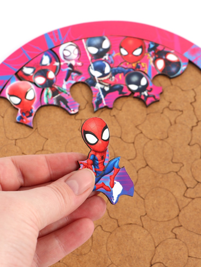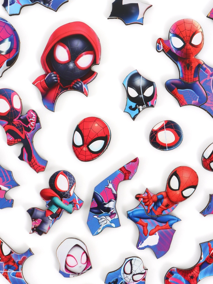 Увлекательный деревянный пазл в оригинальной фигурной форме, посвящённый миру Человека-паука. На яркой и детализированной картинке изображены разные версии Спайдермена — от классического героя до мультяшных и альтернативных персонажей, включая Венома и Паутину. Пазл станет отличным выбором для юных фанатов супергероев и любителей головоломок.