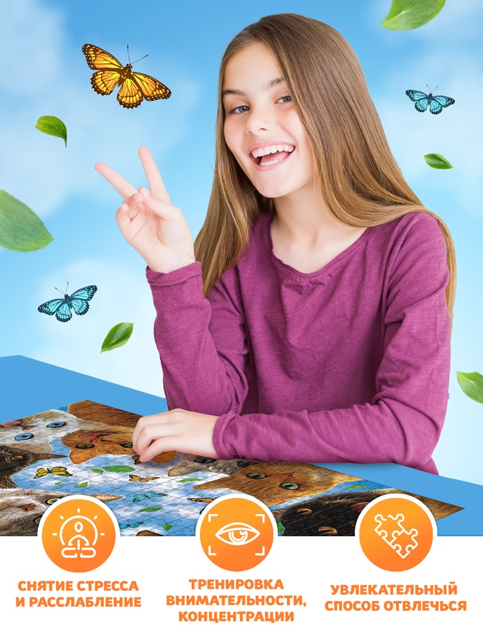 «Любопытные котики» — это пазл для тех, кто ищет не просто картинку, а повод отложить дела и погрузиться в мир уюта. Сотни пушистых хвостов, усиков и взглядов из-под лап — каждый фрагмент будто шепчет: «Собери меня, и я расскажу историю».