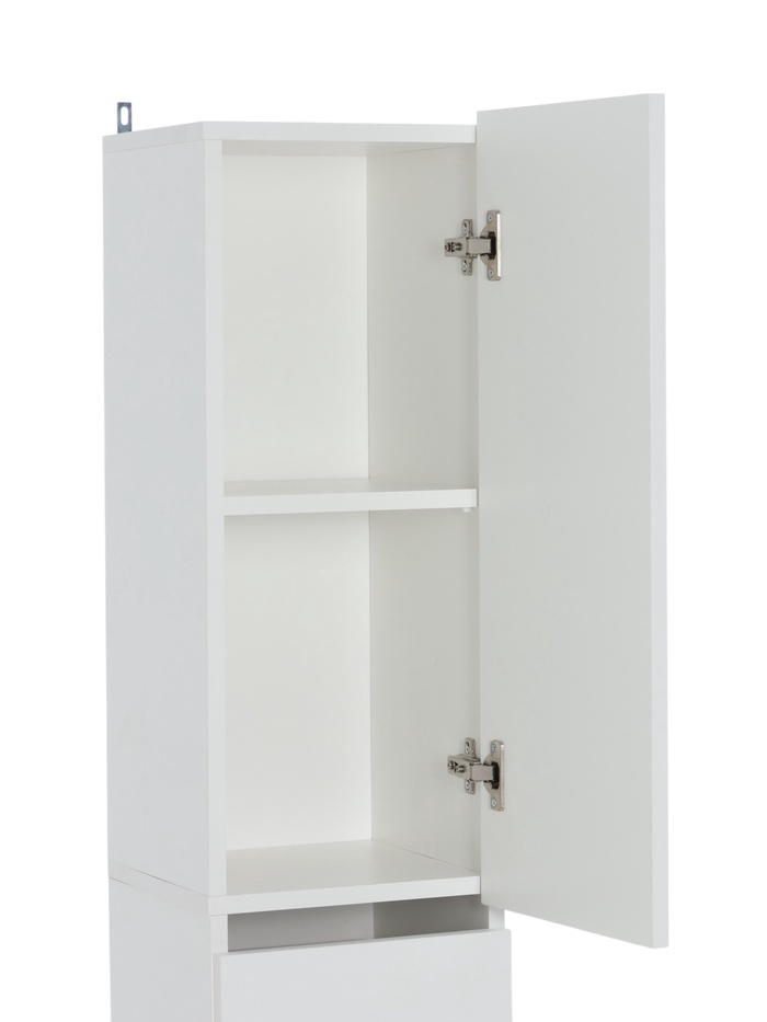 Узкий шкаф-пенал для хранения вещей в жилых помещениях. Конструкция сочетает закрытые отделения и выдвижной ящик, позволяя удобно распределить предметы и эффективно использовать вертикальное пространство.