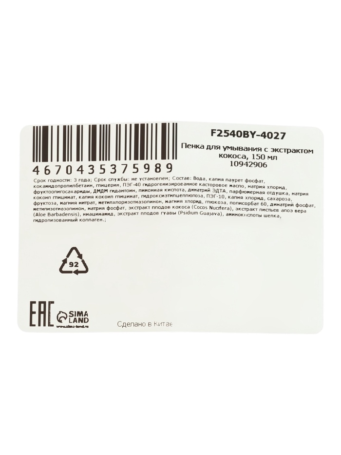 Технические характеристики Пенка для умывания с экстрактом кокоса, 150 мл