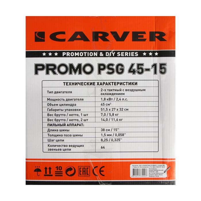 Технические характеристики Пила бенз. Carver PROMO PSG-45-15, 2.4 л.с., 38 см (15"), паз 1.5 мм, шаг 8.25 мм