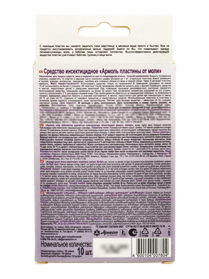 Для надежной защиты одежды от моли: пластины «Армоль» - это простое и эффективное решение для защиты шерстяных, меховых и других вещей от платяной моли. Развесьте пластины в шкафу и забудьте о проблеме испорченных вещей!