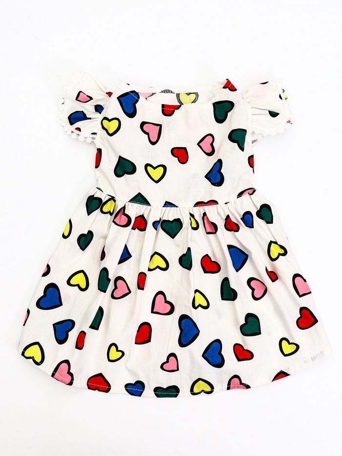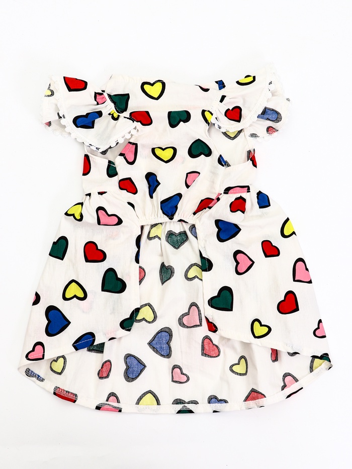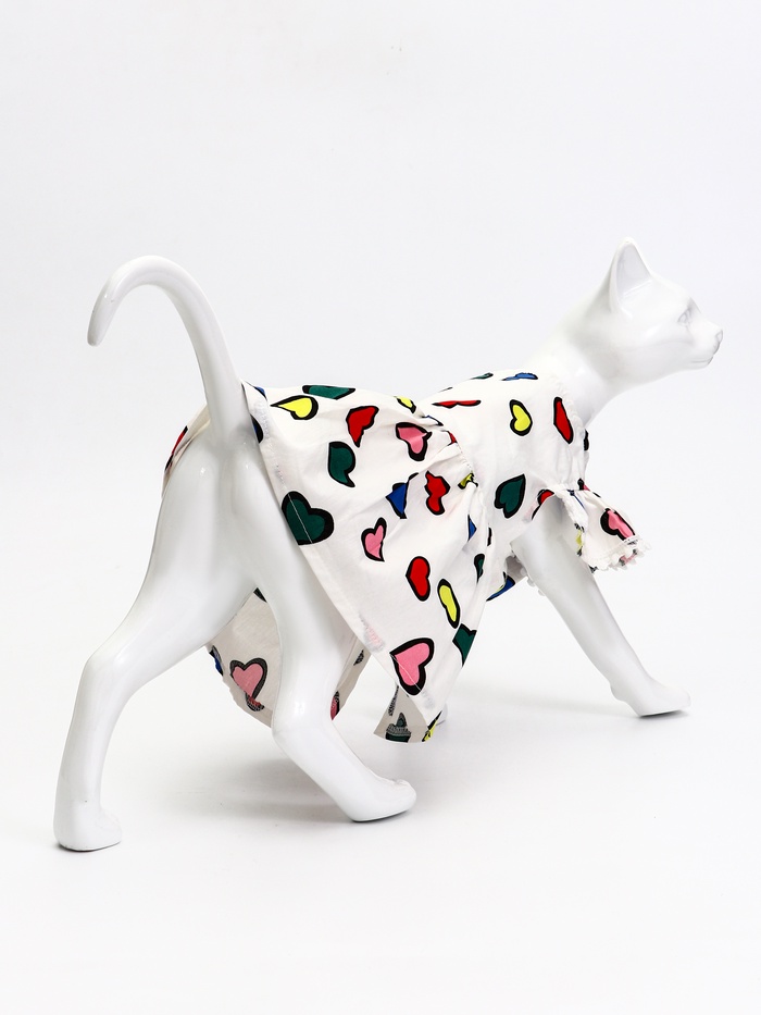 Платье для любимицы — лёгкое, яркое и удобное. Платье «Арлекино» размера L выполнено из гладкого полиэстера в классическом белом цвете с принтом в виде разноцветных сердечек. Рассчитано на собак с обхватом груди 45 см и длиной спинки 35 см.