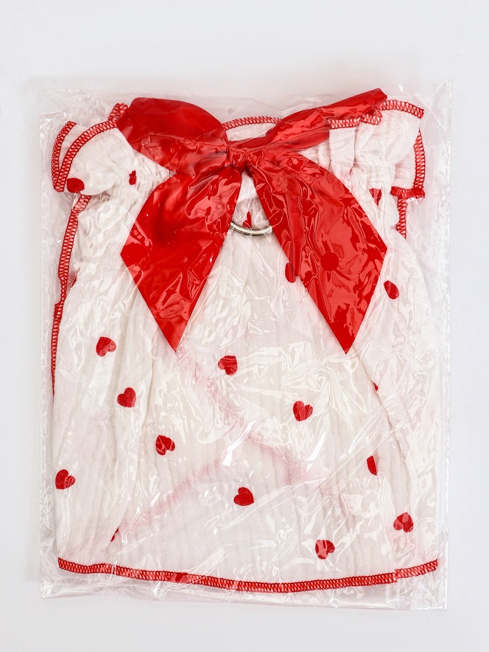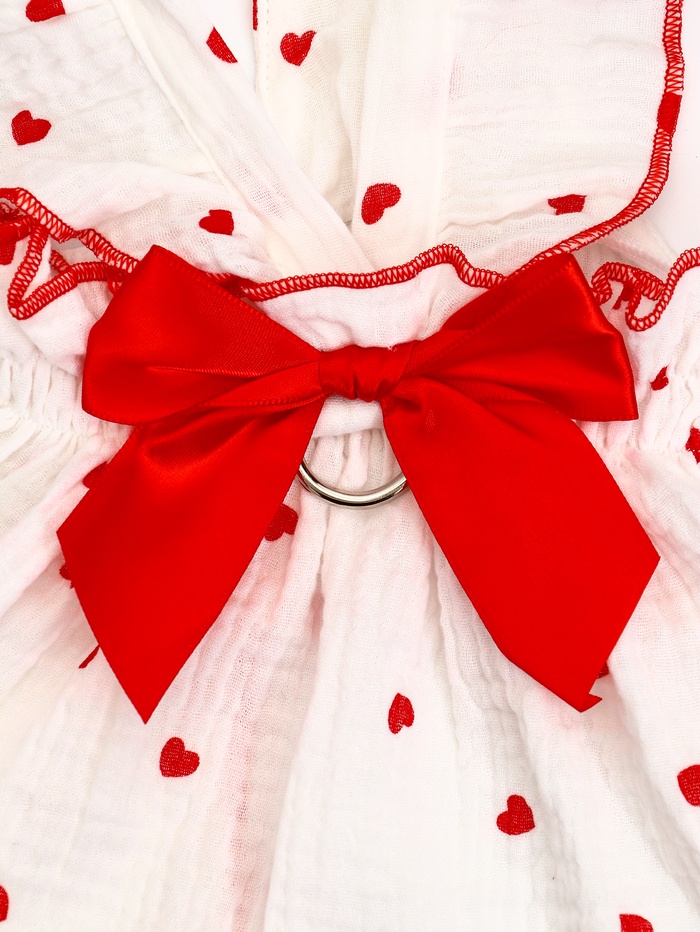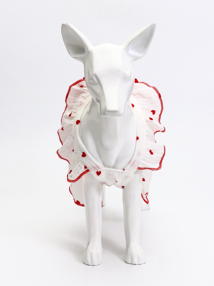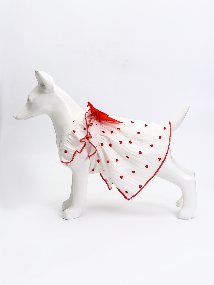 Платье «Зефирка» размера M выполнено из гладкого полиэстера в чистом белом цвете с принтом в виде красных сердечек. Подходит собакам с обхватом груди 40 см и длиной спинки 30 см.