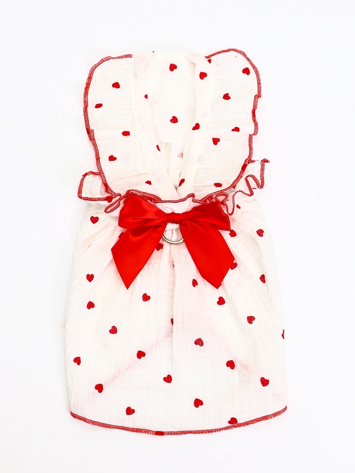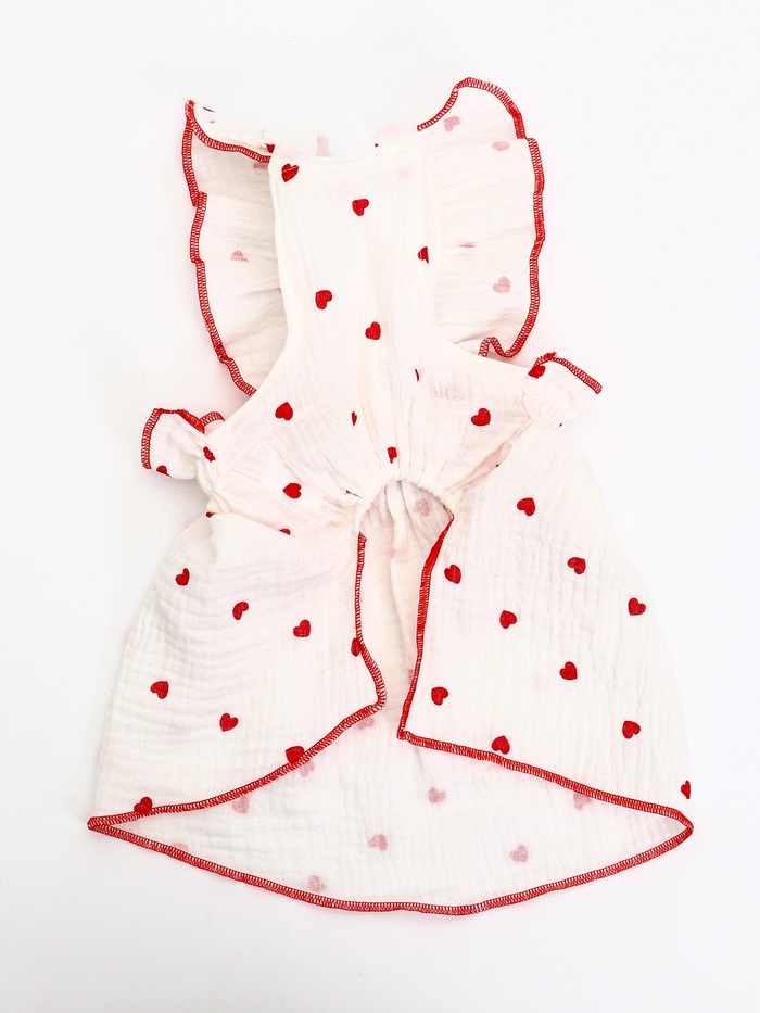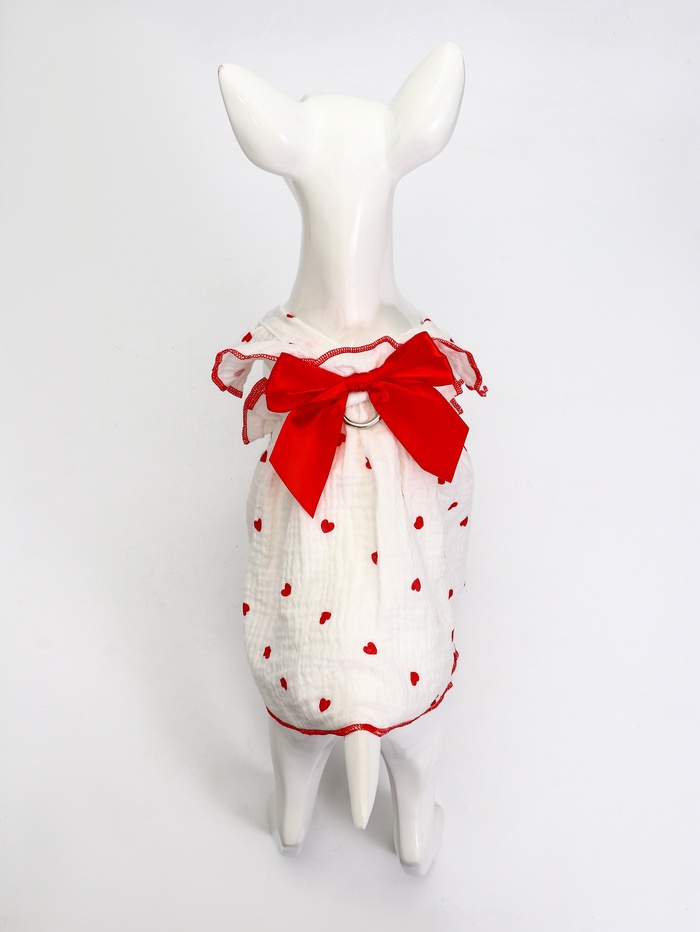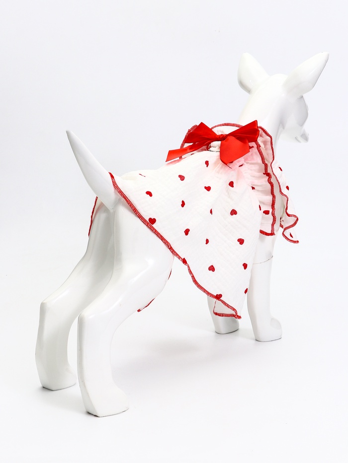 Платье «Зефирка» размера S выполнено из гладкого полиэстера в чистом белом цвете с принтом в виде красных сердечек. Подходит собакам с обхватом груди 40 см и длиной спинки 30 см.