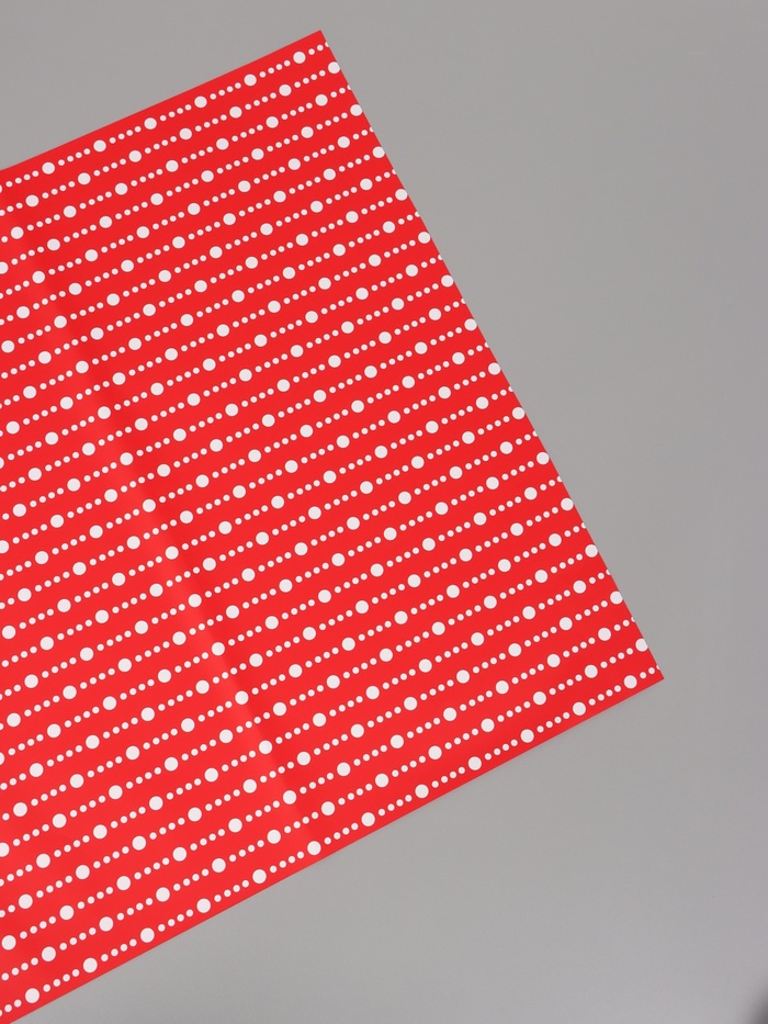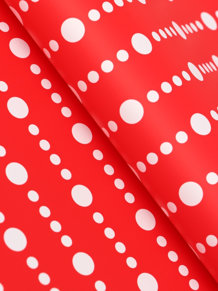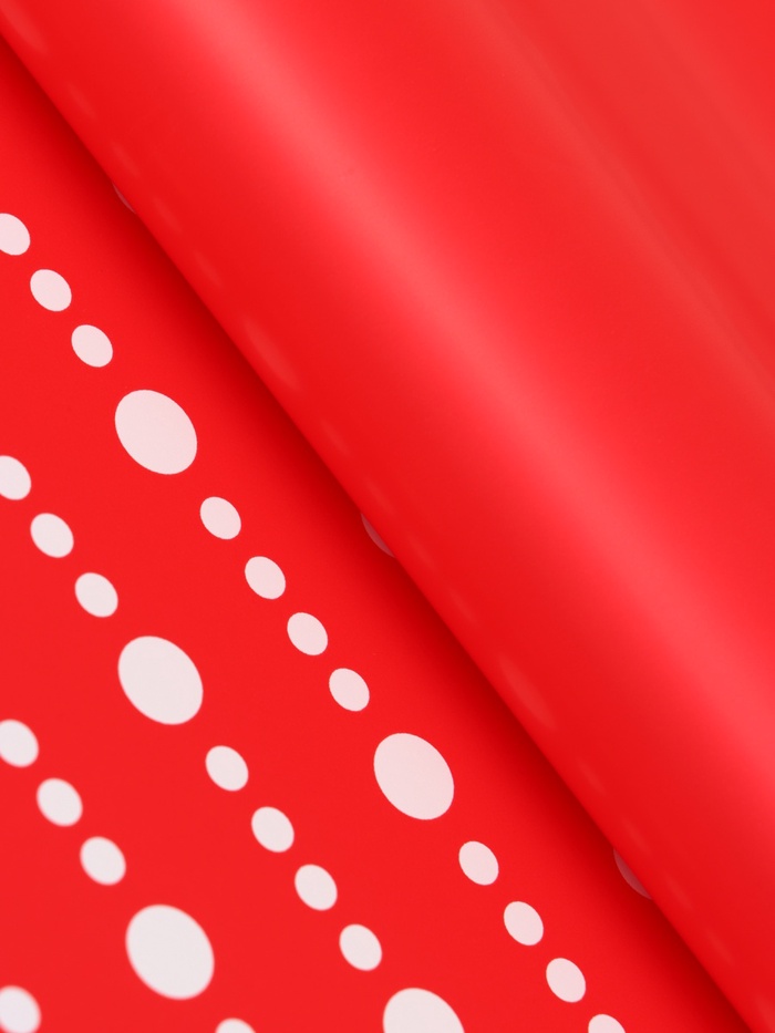 Игривое сияние на алом фоне! Флористическая пленка «Бисер» в красном цвете 57×57 см — это упаковка, сочетающая страсть с лёгкостью. Насыщенный красный фон, усыпанный контрастными белыми горошинами, создаёт динамичный, праздничный и немного винтажный образ.