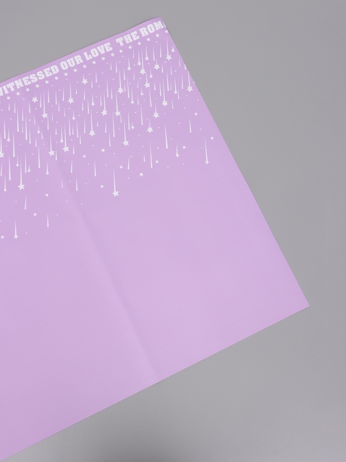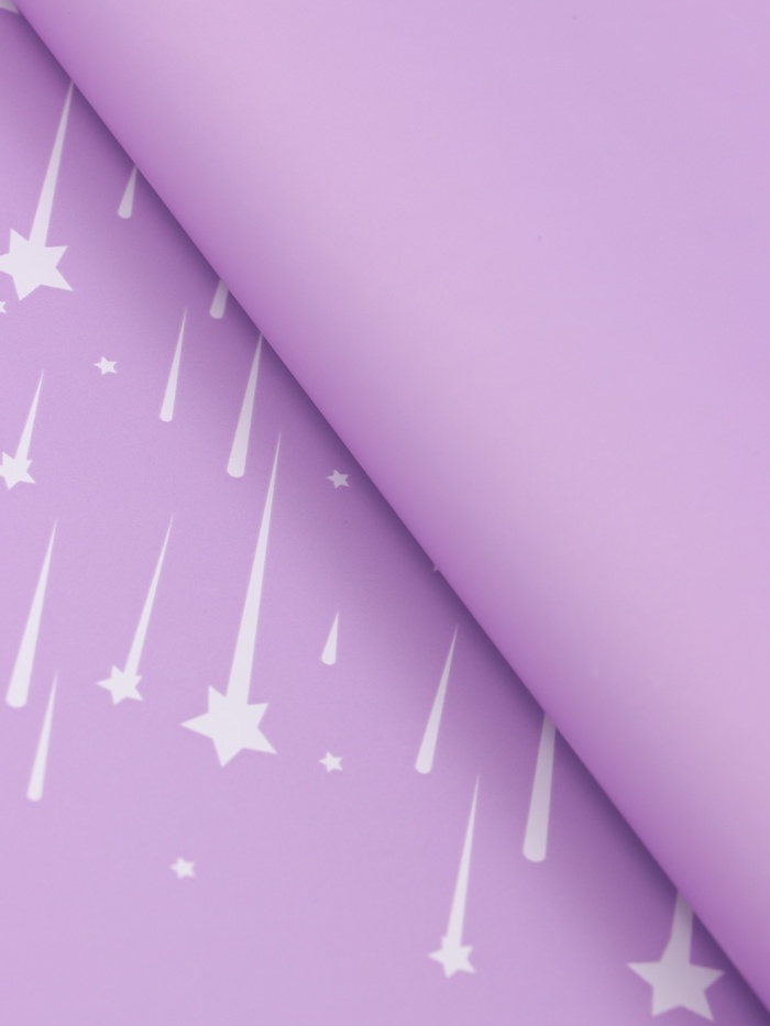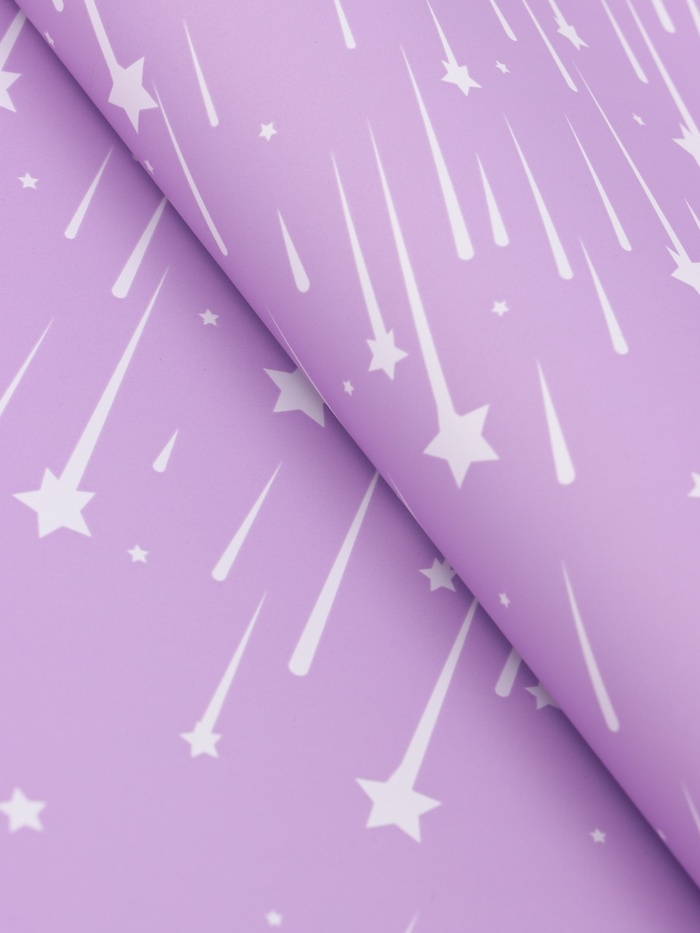 Романтика звёздного дождя! Флористическая пленка «Звездопад» в сиреневом цвете 57×57 см — это упаковка с волшебной атмосферой. Нежный сиреневый фон и белый узор из звёзд и капель создают поэтичный образ ночного неба, полного загадок и обещаний.