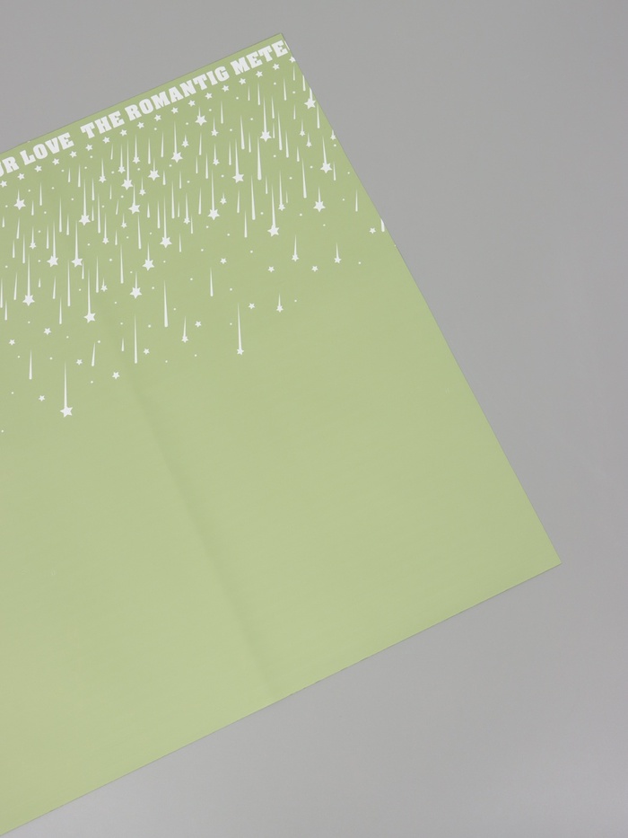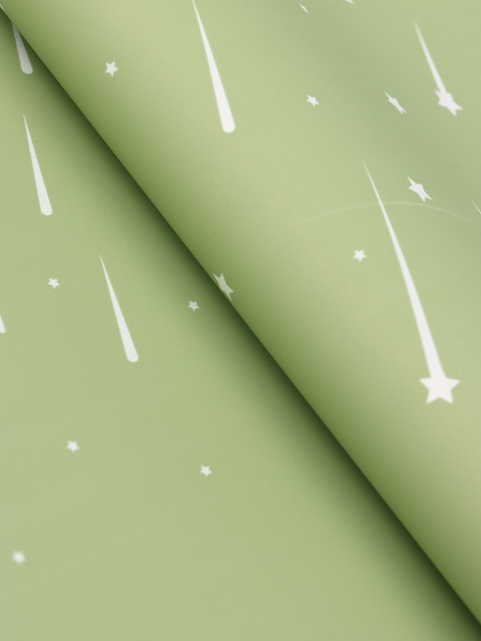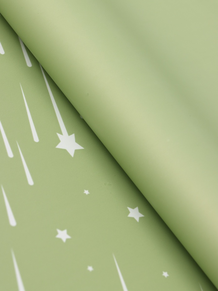 Звёздный дожь в весеннем саду! Флористическая пленка «Звездопад» в нежно-зелёном цвете 57×57 см — это упаковка, соединяющая магию неба и свежесть земли. Светлый зелёный фон и парящий белый узор создают ощущение обновления, надежды и тихого волшебства.