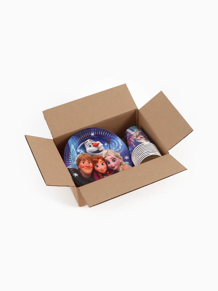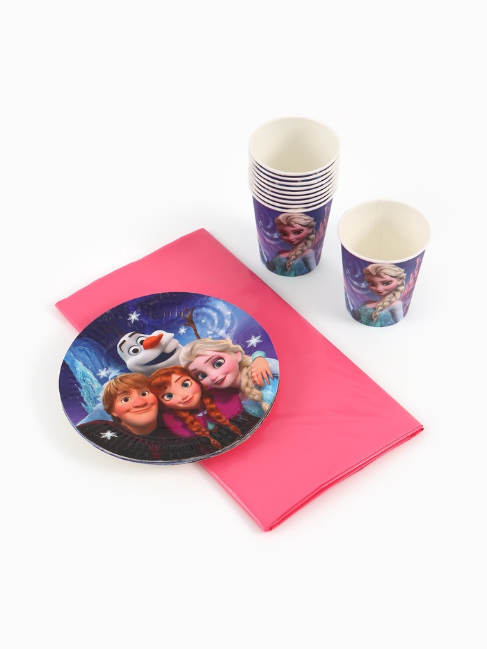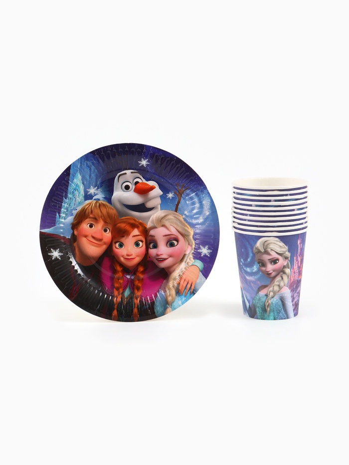 Одноразовая бумажная посуда на 10 персон, «Холодное сердце» — яркий и атмосферный комплект для оформления детского праздника в стиле любимого мультфильма! В набор входят: тарелки, стаканы и скатерть, выполненные из картона с печатью: на изделиях — сёстры Анна и Эльза, снежный Олаф, Северное сияние, снежинки и нежные зимние узоры в фирменной палитре. Подходят для прохладных и тёплых блюд и напитков, удобны в использовании и легко утилизируются.