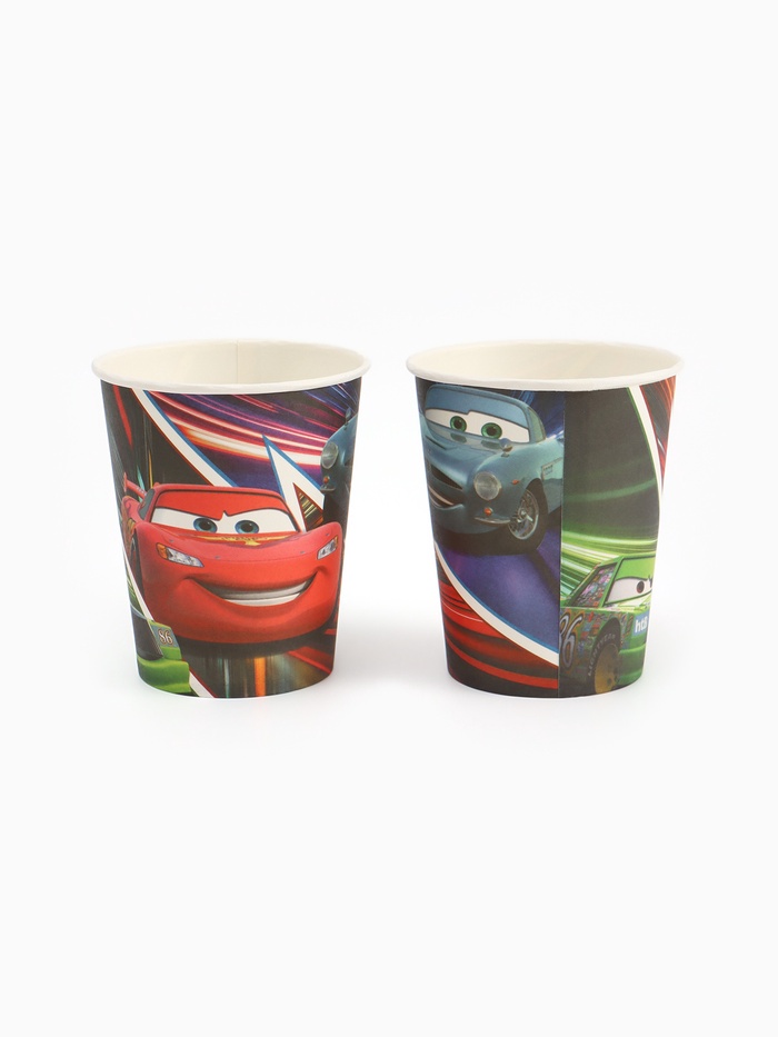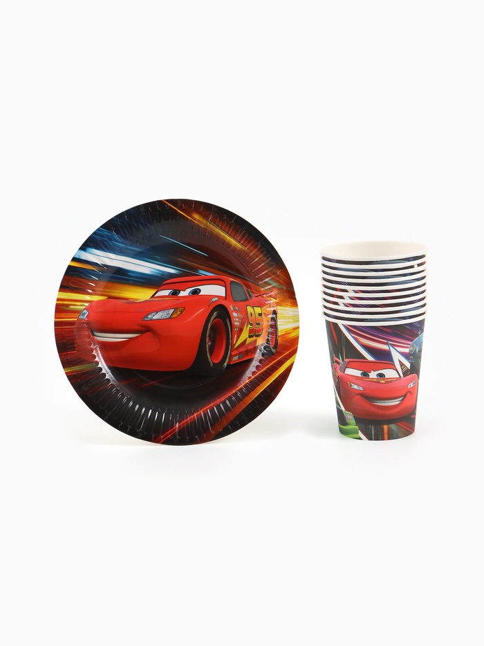 Посуда одноразовая бумажная на 10 персон: стаканы, тарелки, скатерть, Тачки