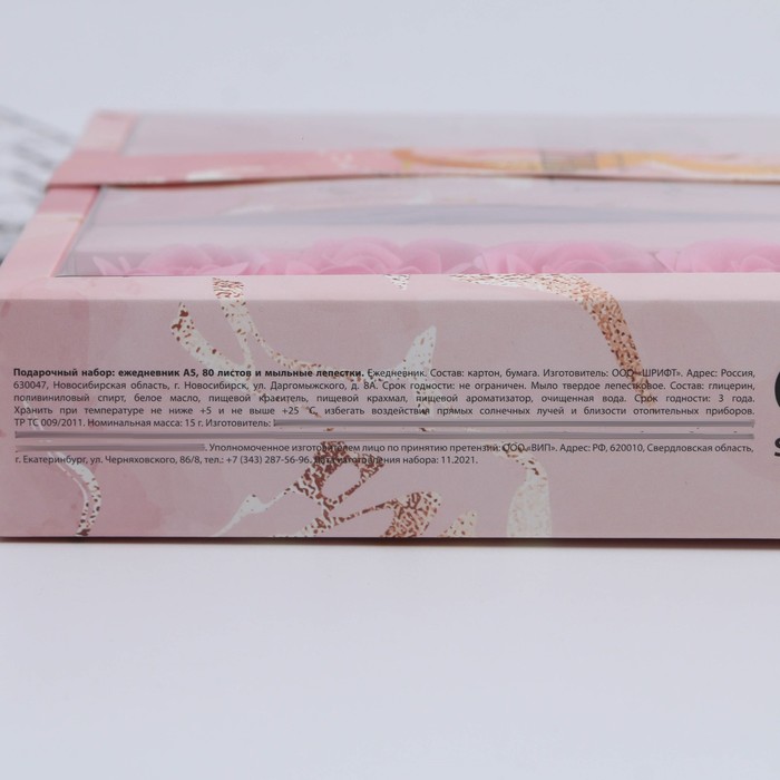 | Составляющие набора | Ежедневник; Мыльные лепестки |