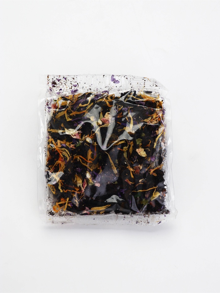 Состав: индийский чёрный байховый чай, банановые чипсы, лепестки сафлора, цветки апельсинового дерева, цукаты манго, ананаса и папайи, кусочки сушеного яблока, лепестки мальвы, лепестки календулы.