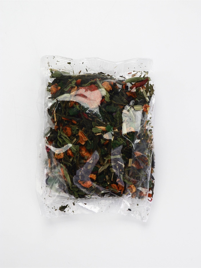 Состав: чай зелёный байховый Сенча, кусочки сушеного яблока, лимонная трава, лист мяты, сублимированная клубника, каркаде, цукаты манго.