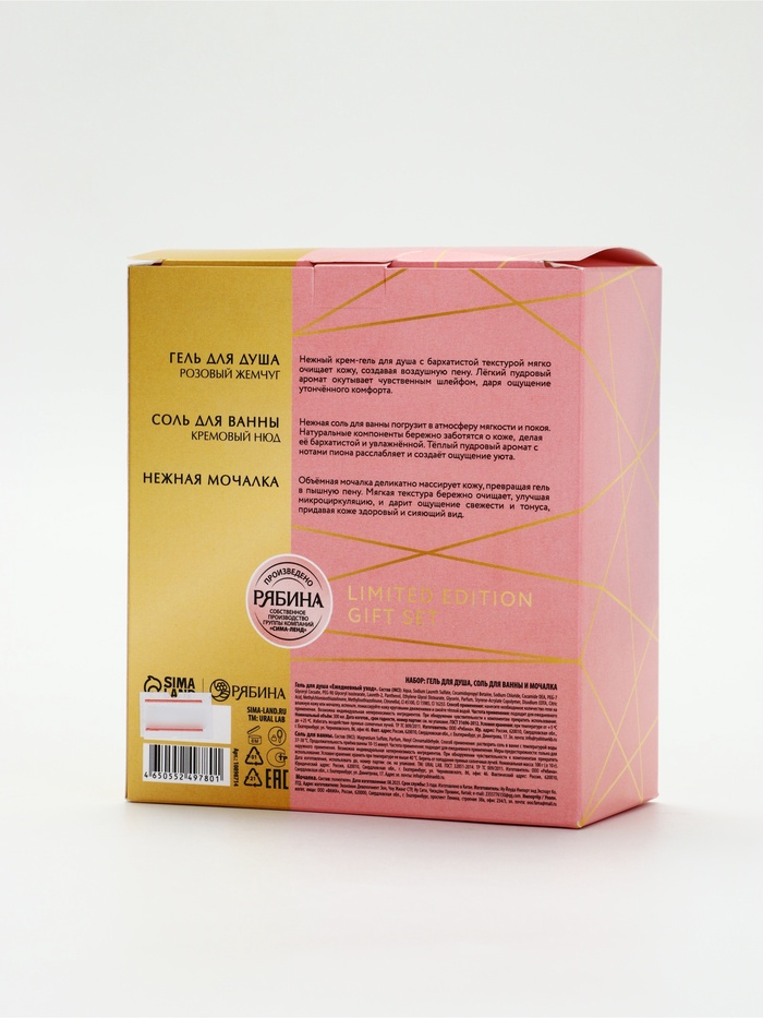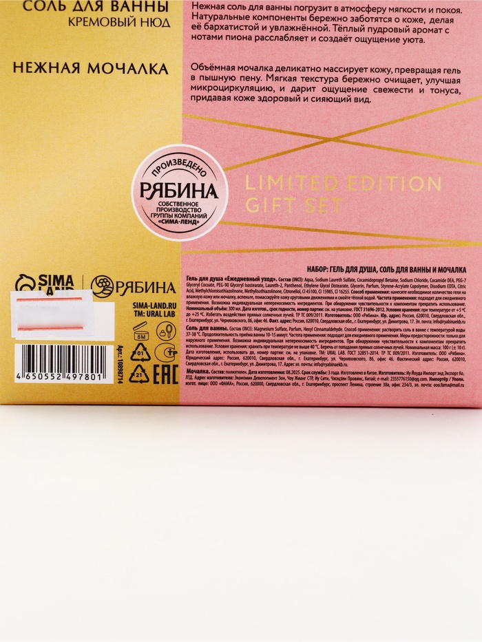 | Составляющие набора | Гель для душа; Мочалка; Соль для ванны |