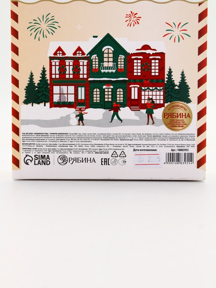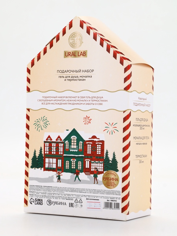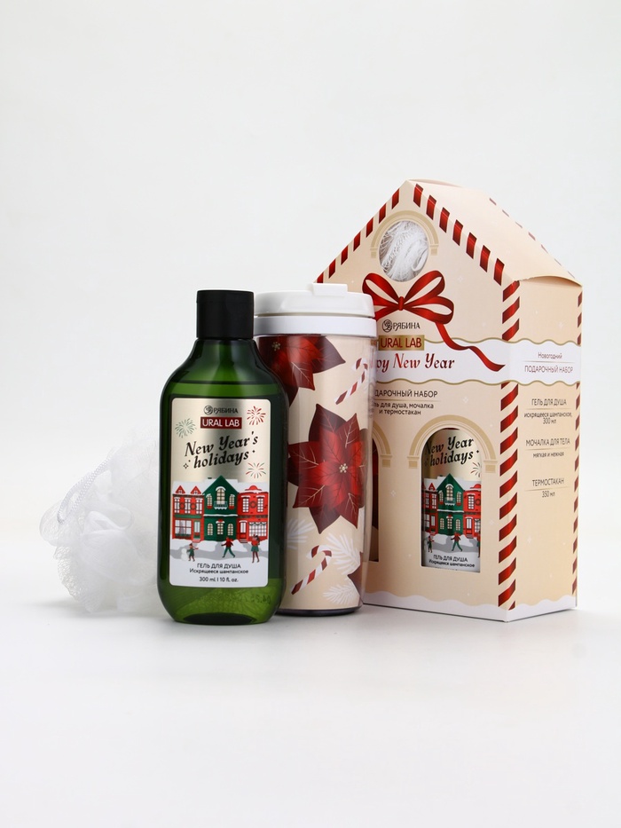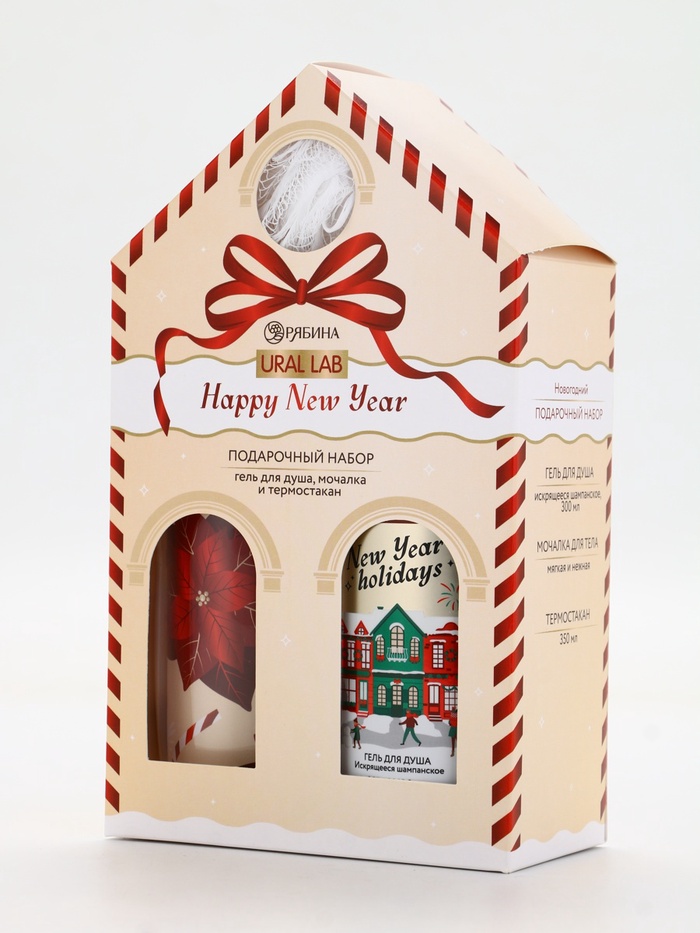 Технические характеристики Подарочный набор Happy New Year: гель для душа, мочалка и термостакан, аромат шампанское, URAL LAB