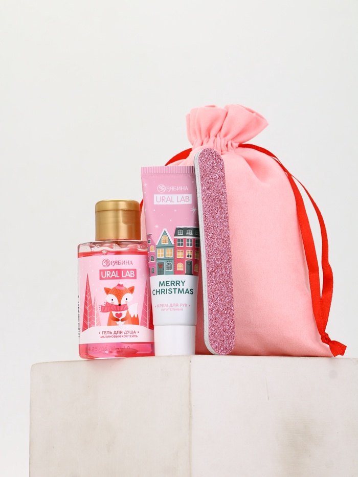 Технические характеристики Подарочный набор косметики в мешке: крем для рук, пилочка, гель для душа, аромат малиновый коктейль, URAL LAB