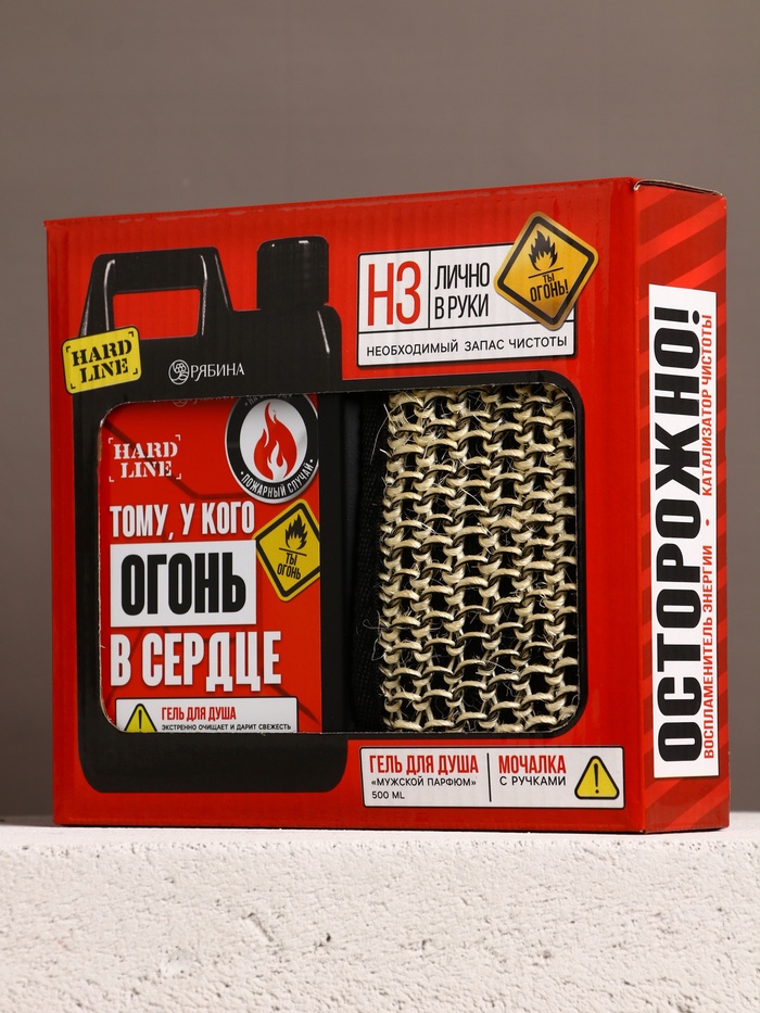 Подарочный набор «Мужику огонь», гель для душа канистра 500 мл и мочалка лента, HARD LINE