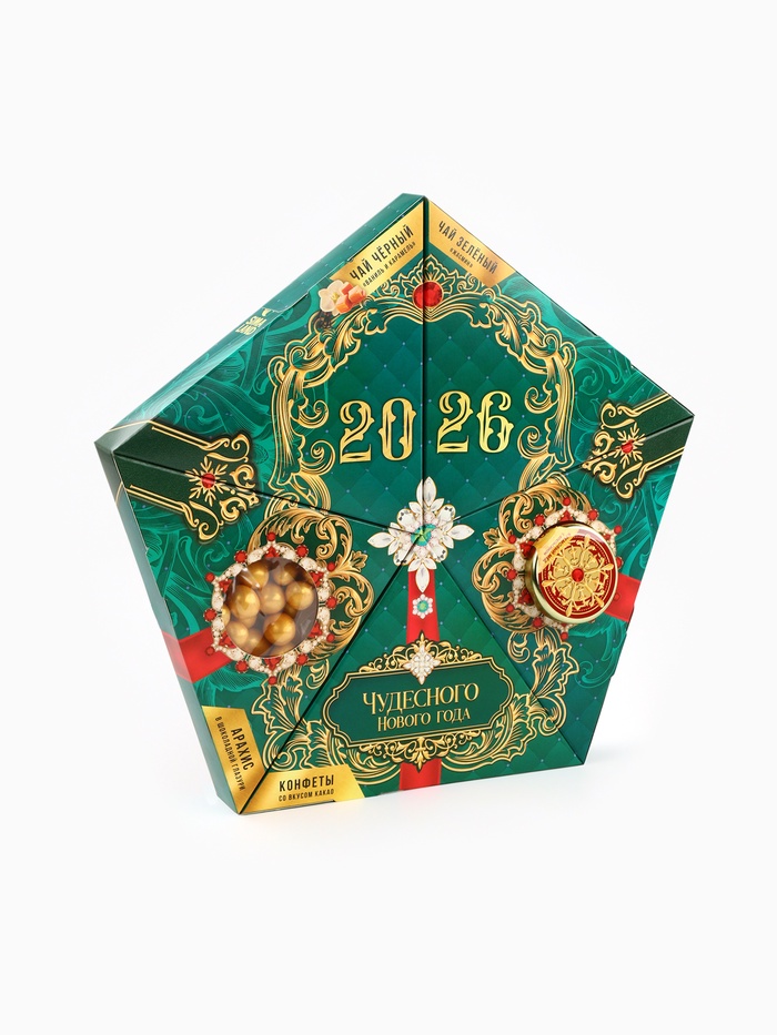 Подарочный набор новогодний «Время чудес»: чай зеленый, чай чёрный, арахис в глазури, конфеты, крем - мёд