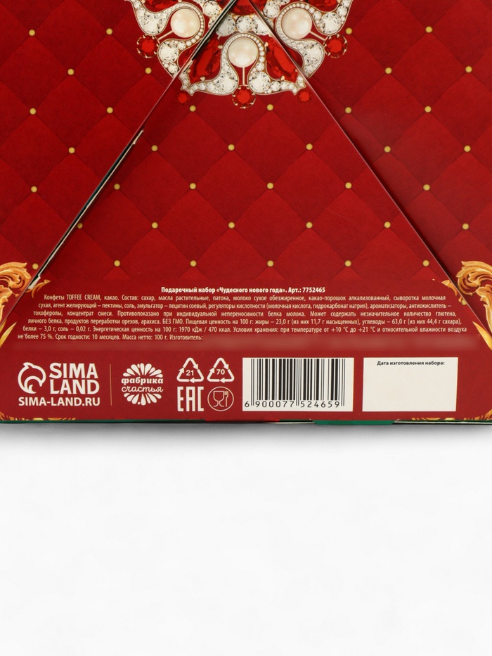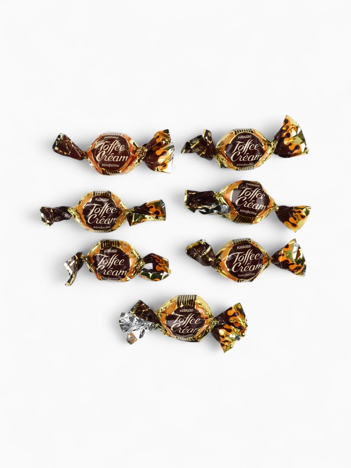 Состав: сахар, заменитель масла какао нетемперируемый лауринового типа (масло пальмоядровое, масло пальмоядровое рафинированное дезодорированное гидрогенизированное, эмульгаторы (Е492, Е322)), сыворотка молочная сухая, какао-порошок, ПЭК «Рис воздушный» (крупа рисовая, мука пшеничная, сахар, соль), патока, носитель – карбонат кальция (Е170), кукурузный крахмал, соль, эмульгаторы (лецитин соевый Е322, E476), ароматизаторы: «Коньяк», «Ванилин». Может содержать следы арахиса, орехов.
