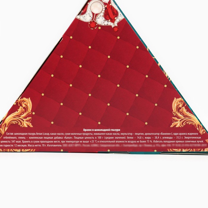 Состав: шоколадная глазурь белая (сахар, какао-масло, какао-порошок, эквивалент какао-масла, эмульгатор – лецитин, ароматизатор «Ванилин»), ядро арахиса жареного отбелённого, глянец – комплексная пищевая добавка «Капол».