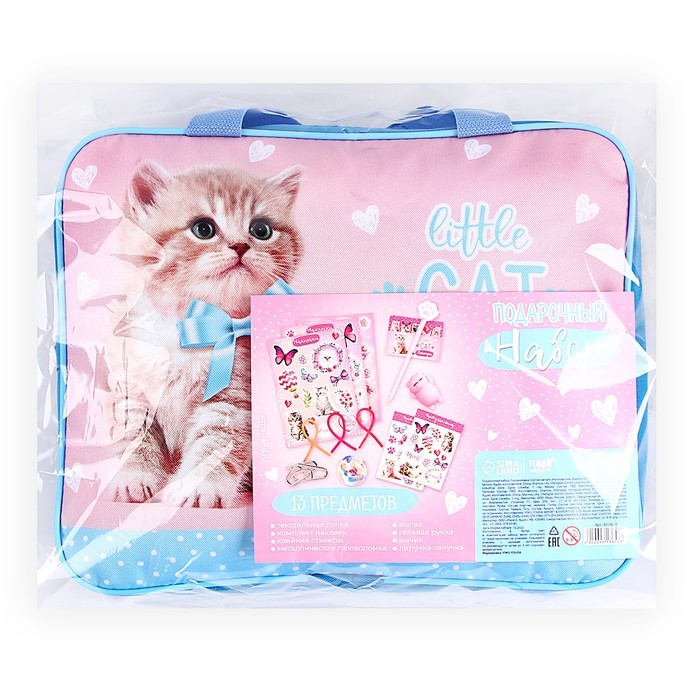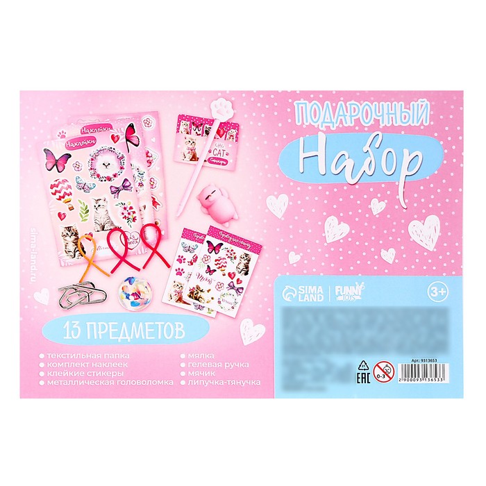 Составляющие набора | Головоломка; Игрушка-антистресс; Мячик; Наклейки; Папка для тетрадей; Переводная тату; Резинка; Ручка; Стикеры |
