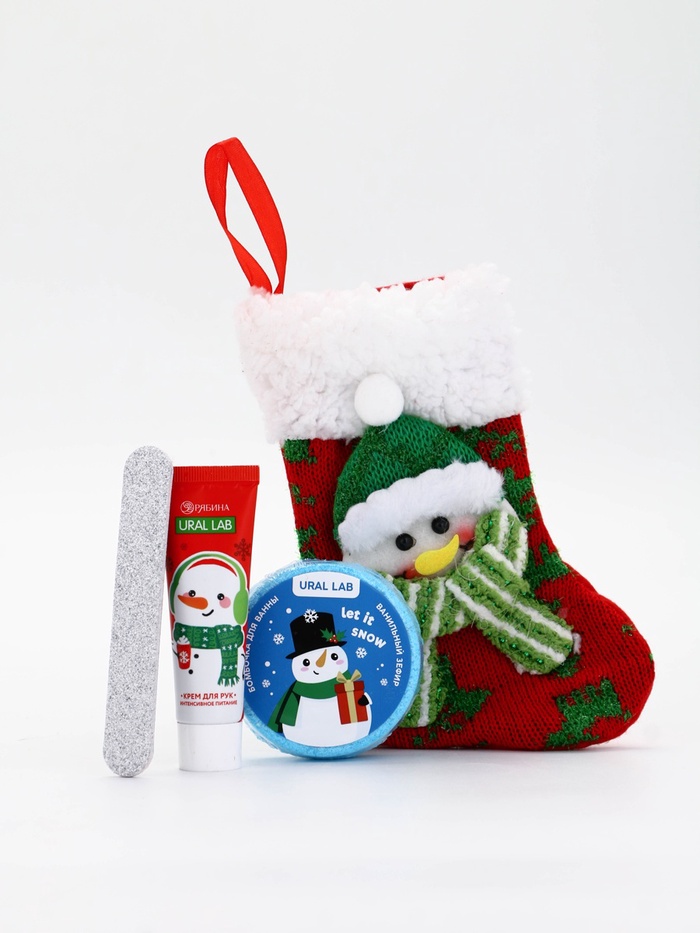 Подарочный набор в новогоднем носке «Снеговик», крем для рук, бомбочка для ванны и пилка для ногтей, URAL LAB