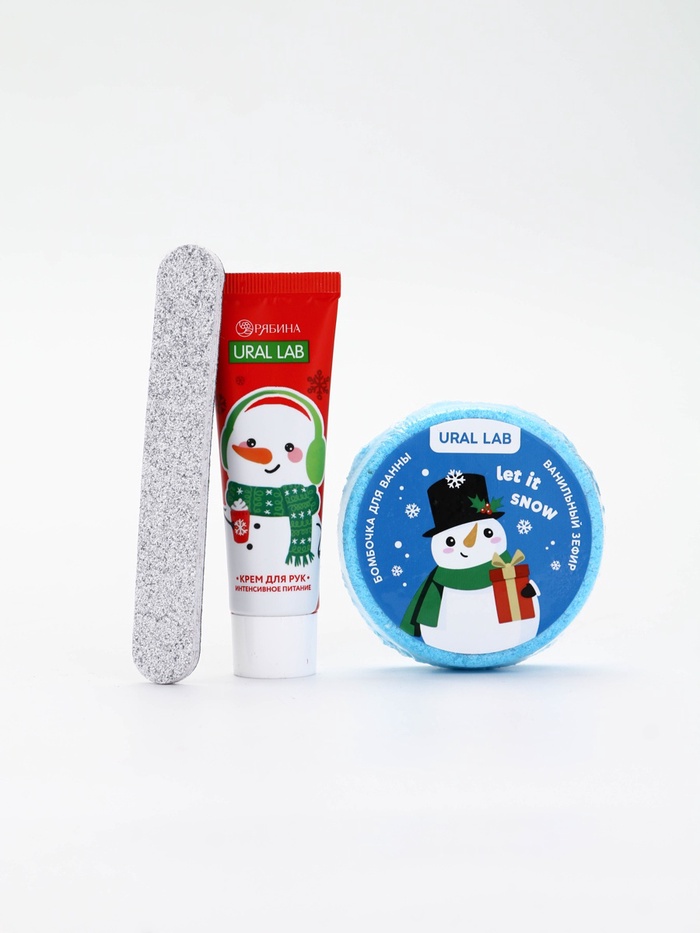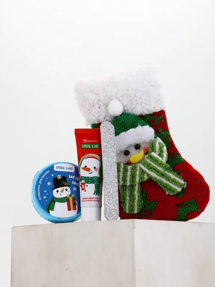 Технические характеристики Подарочный набор в новогоднем носке «Снеговик», крем для рук, бомбочка для ванны и пилка для ногтей, URAL LAB