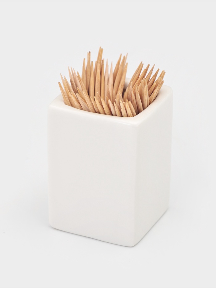 Фарфор не впитывает влагу и посторонние запахи, поэтому подставка сохраняет свежесть даже при длительном использовании. Гладкая поверхность легко очищается от пыли и загрязнений. Предмет подойдёт для ежедневного применения: достаточно наполнить ёмкость зубочистками и поставить в удобном месте — на обеденном столе, кухонной стойке или в зоне кофе-брейка.