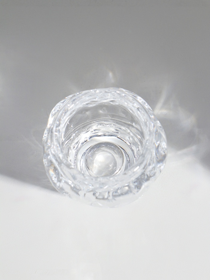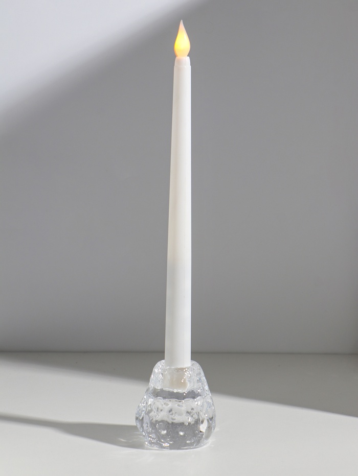 Прозрачный подсвечник для одной свечи создаёт эффект застывшего льда. Его форма напоминает раскрывающийся бутон. Универсальный дизайн впишется в любой интерьер — от современной гостиной до уютной спальни. Это готовое решение для романтического ужина, медитации или создания праздничной атмосферы.