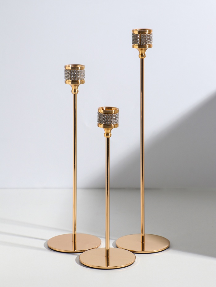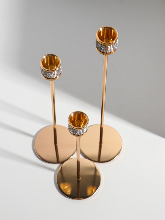 Этот набор из трёх золотых подсвечников создаёт утончённое сияние для вашего интерьера. Разная высота каждого изделия позволяет выстраивать динамичные композиции на праздничном столе, каминной полке или комоде. Универсальный дизайн с акцентом в виде стразового кольца добавляет торжественности любому событию — от романтического ужина до новогоднего декора.