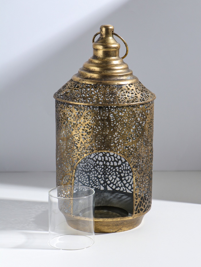 Этот золотой подсвечник-фонарь создаёт особенное настроение для уединённых моментов и торжественных событий. Его классическая форма с ажурными элементами напоминает уютный садовый фонарь, наполняя пространство тёплым, живым светом пламени. Идеальный акцент для создания атмосферы спокойствия и уюта во время Рамадана, романтического ужина или медитации.