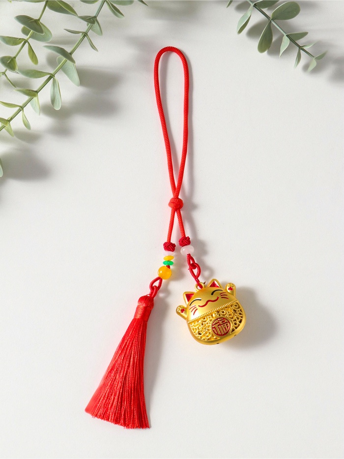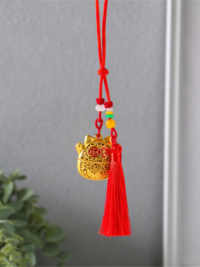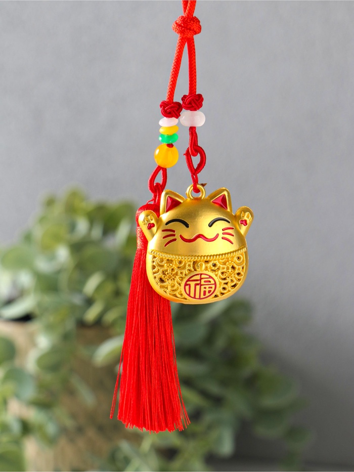 Этот красный с золотом талисман приносит в дом удачу и процветание. Фигурка кошки с поднятыми лапками — классический символ благополучия, приглашающий успех. Изящная кисточка добавляет оберегу динамики и завершённости.