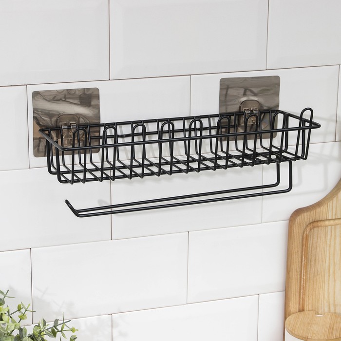 Полочка для губок и моющего средства, с держателем для полотенец, на липучке, чёрная