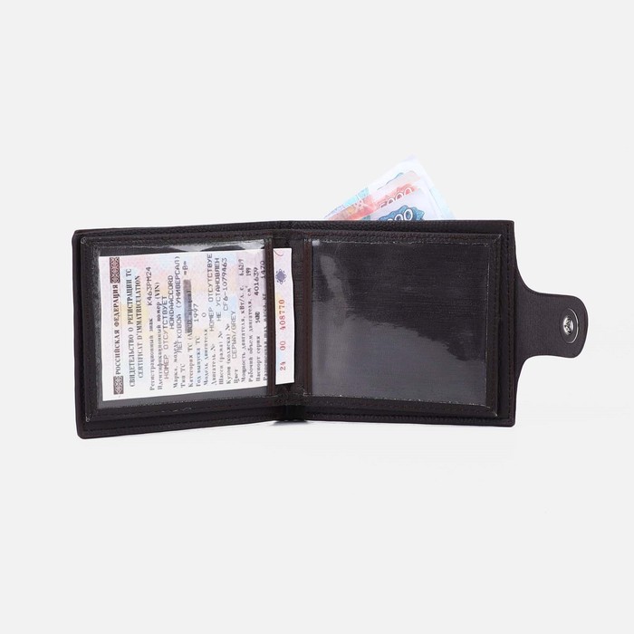 Этот темно-коричневый мужской кошелек объединяет хранение денег и документов в одном аксессуаре. Модель среднего размера заменяет несколько отдельных предметов, создавая порядок в кармане или барсетке. Магнитная застежка обеспечивает легкий доступ к содержимому и надежную защиту.