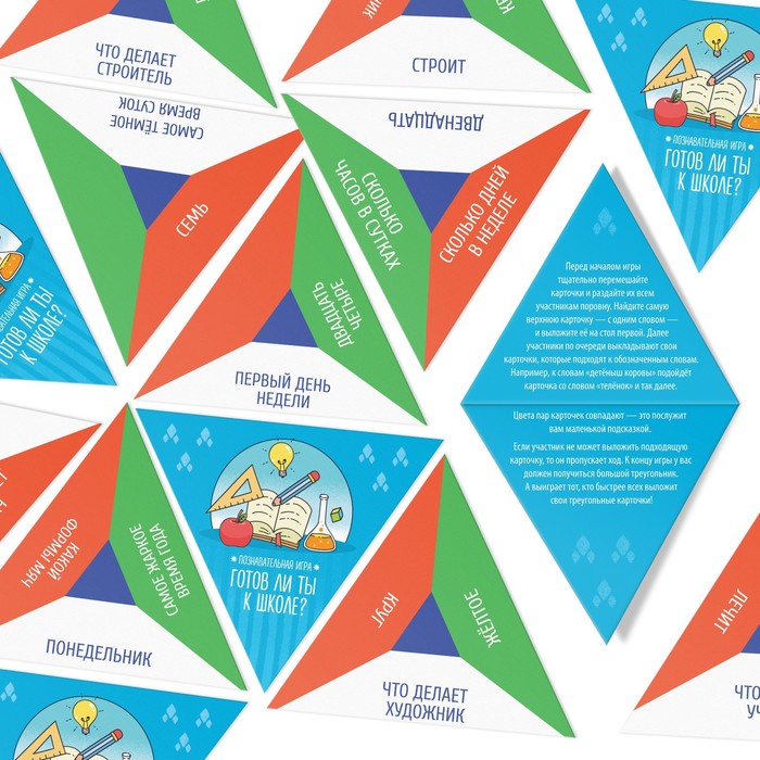 Далее все в порядке очереди выкладывают свои карточки так, чтобы слова на них были связаны по смыслу, например: «детёныш коровы» и «телёнок» и т. д. К концу игры у вас должен получиться большой треугольник. Карточки одной темы совпадают по цвету — это послужит небольшой подсказкой.