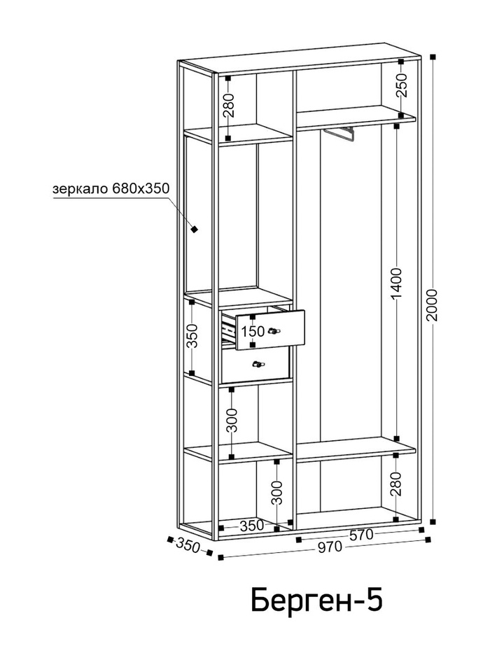 Технические характеристики Прихожая «Берген – 5», 970×350×2000 мм, цвет винтерберг/белый