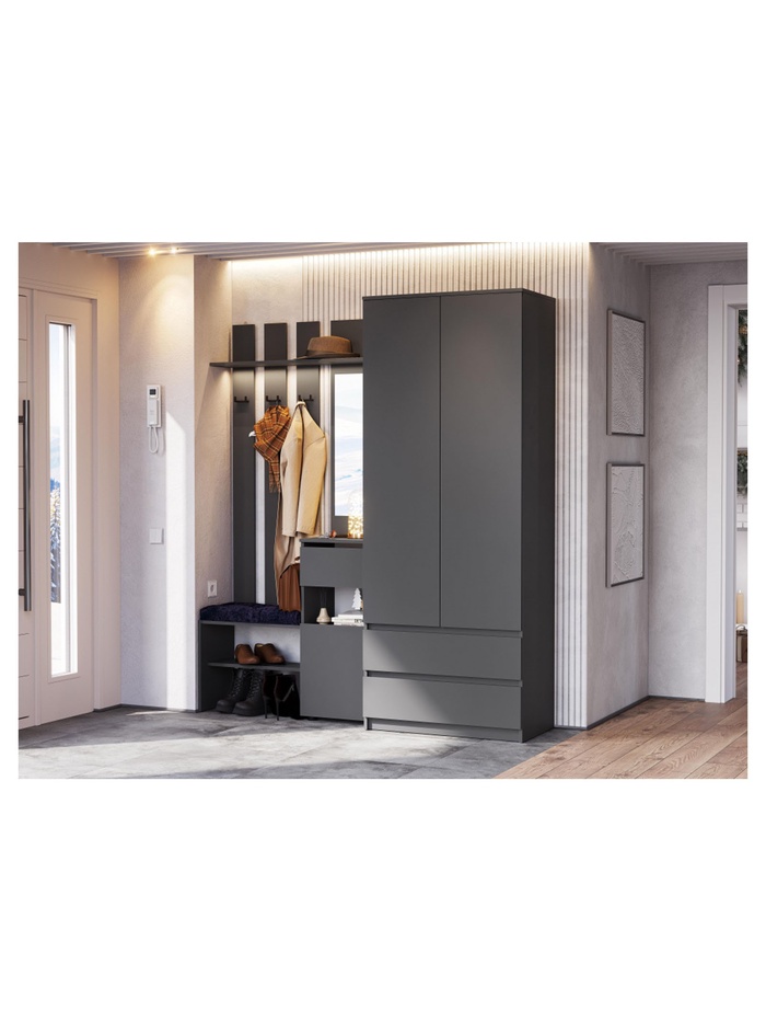 Современная прихожая «Сибити» в графитово-сером оттенке сочетает стильный дизайн и практичность. Модель создана для организации функционального пространства в прихожей, обеспечивая удобное хранение обуви, одежды и аксессуаров.