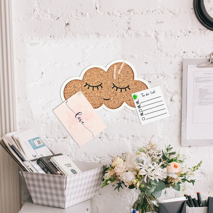 Пробковая доска станет стильным атрибутом детской или рабочего пространства. Она напомнит вам о самых важных делах, времени встречи и месте, куда нужно отправиться. Кроме записок на неё можно крепить фотографии, открытки и другие подобные вещи — для этого понадобится лишь пара кнопок.