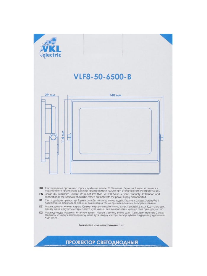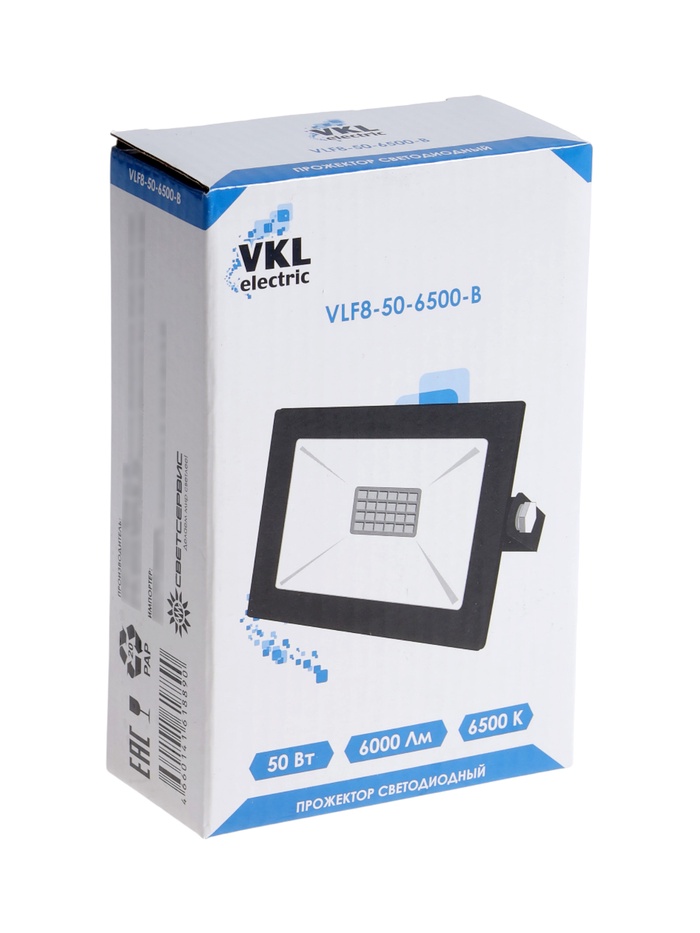 Прожектор светодиодный VKL Electric, 50 Вт, 6000 лм, 6500К, IP65, 220 В чёрный, свечение холодное белое