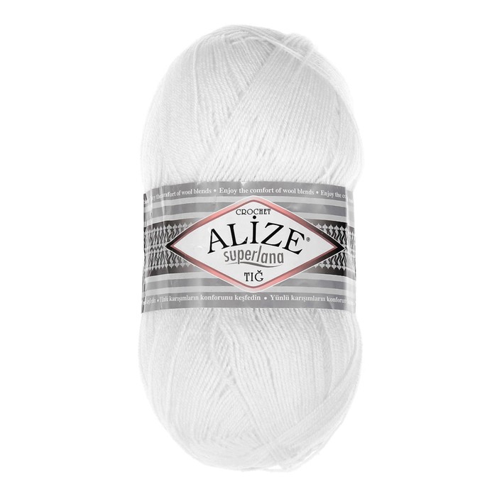 Технические характеристики Пряжа "Superlana tig" 25% шерсть, 75% акрил 570м/100гр (55 белый)