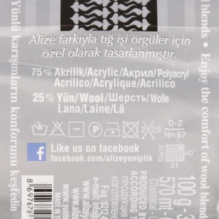 | Материалы из которых произведен товарАкрил 75%, шерсть 25% | Минимальная партия1 | Объем бокса25.682 |