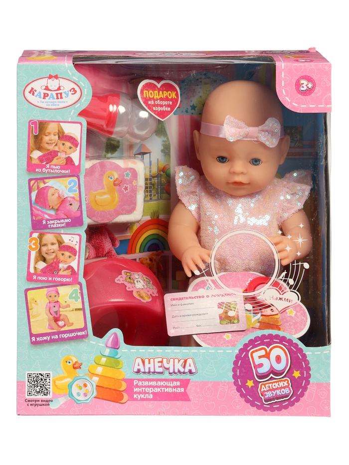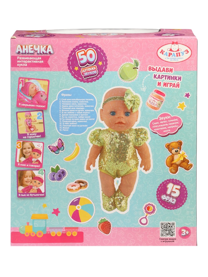 «Анечка» — это игровая кукла-малышка, с которой ребёнок может по-настоящему ухаживать и общаться. Она пьёт из бутылочки, ходит на горшок, закрывает глазки и озвучивает около 50 естественных детских звуков. Ребёнок пробует роль заботливого родителя, учится проявлять внимание и нежность, а игра становится понятной и близкой к реальной жизни. Кукла реагирует на действия: когда её укладывают, она закрывает глаза, когда поят из бутылочки — потом «писает», может смеяться, лепетать или хныкать. Звуки радости и недовольства помогают ребёнку лучше понимать эмоциональные реакции и вовлекаться в игру охотнее.