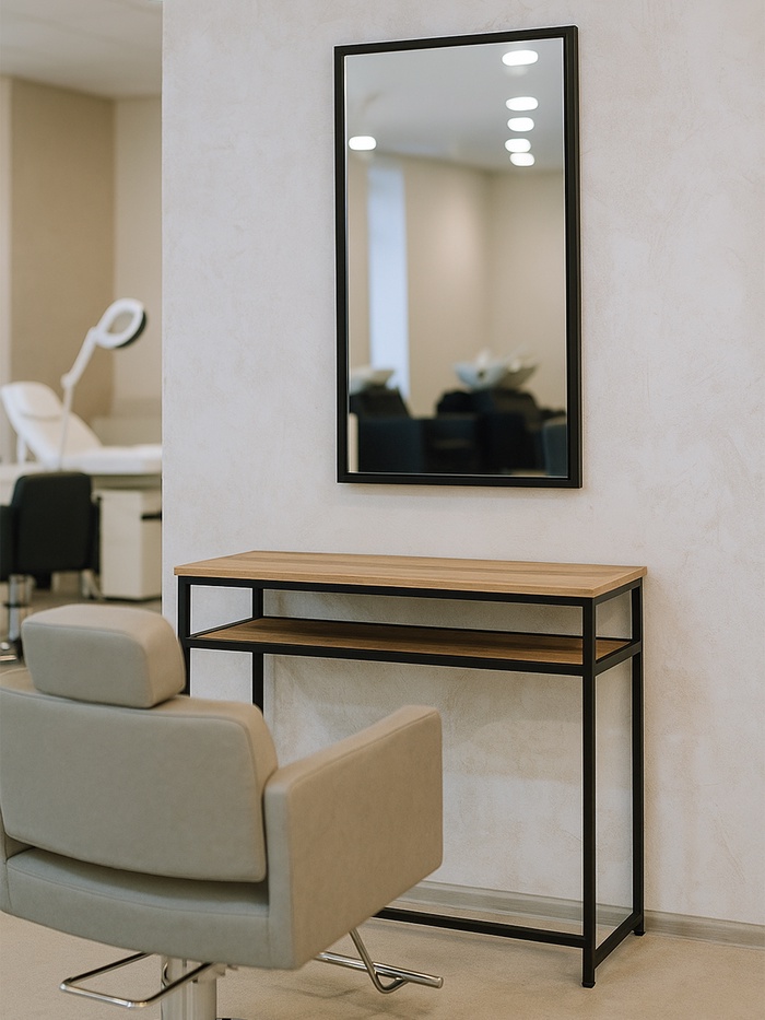 Рабочий стол ТЭКТУМ — стильное и функциональное решение для парикмахерских и салонов красоты. Эта модель из коллекции ТЭКТУМ сочетает в себе удобство, эргономичность и практичность. Каркас стола выполнен из металла с порошковым покрытием, что обеспечивает долговечность и стойкость к повреждениям. Рабочая поверхность и полка сделаны из качественного ЛДСП, что придает мебели надежность и стильный внешний вид. Основной особенностью рабочего стола является просторная столешница, которая предоставляет достаточно места для работы и хранения. Полка образует нишу, идеально подходящую для организации инструментов и аксессуаров парикмахера. Продуманная конструкция включает удобную опору для ног, что обеспечит комфорт клиенту. Опора защитит стены от загрязнений и добавит эргономичности в процессе работы. Рабочий стол ТЭКТУМ можно использовать как в комплекте с зеркалом, так и отдельно — как стол для инструментов или подставку для различных принадлежностей. Выдвижной фенодержатель заказывается отдельно в качестве дополнительной опции. Рабочий стол ТЭКТУМ — это идеальный выбор для профессионалов, которые ценят комфорт, функциональность и стиль.