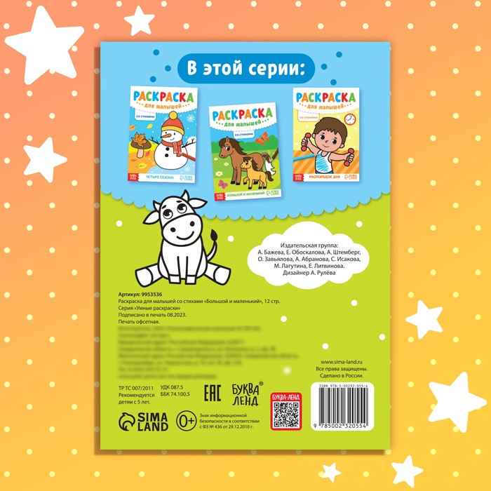 Технические характеристики Раскраска для малышей со стихами «Большой и маленький», 12 стр.