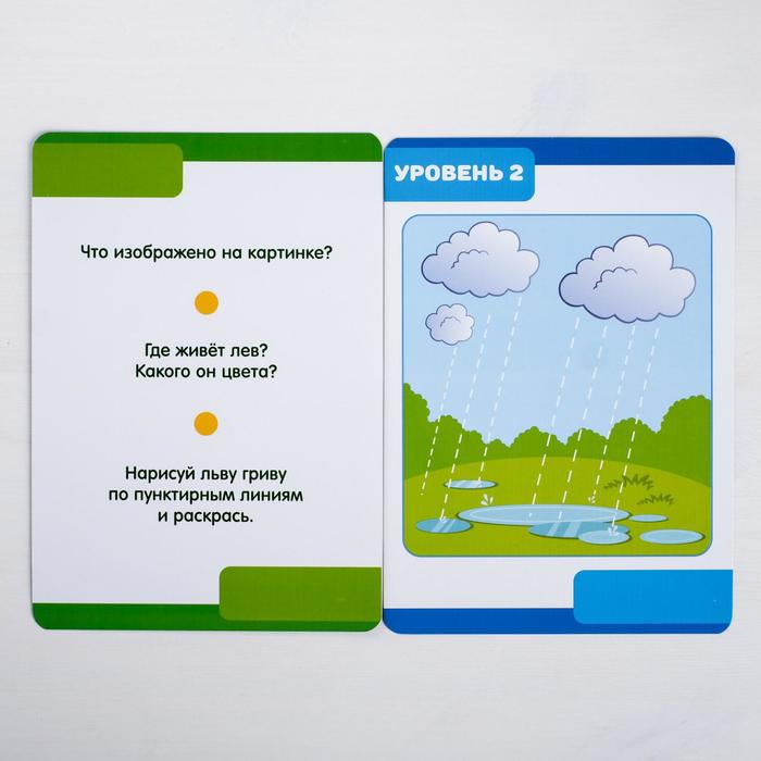 Карточки разделены на 3 уровня сложности. Начните с уровня 1, а затем переходите к следующим. На одной стороне карточки нарисована картинка, которую нужно показать крохе. На другой — вопросы, которые родитель может задавать. Рассматривайте карточки, отвечайте и развивайтесь!