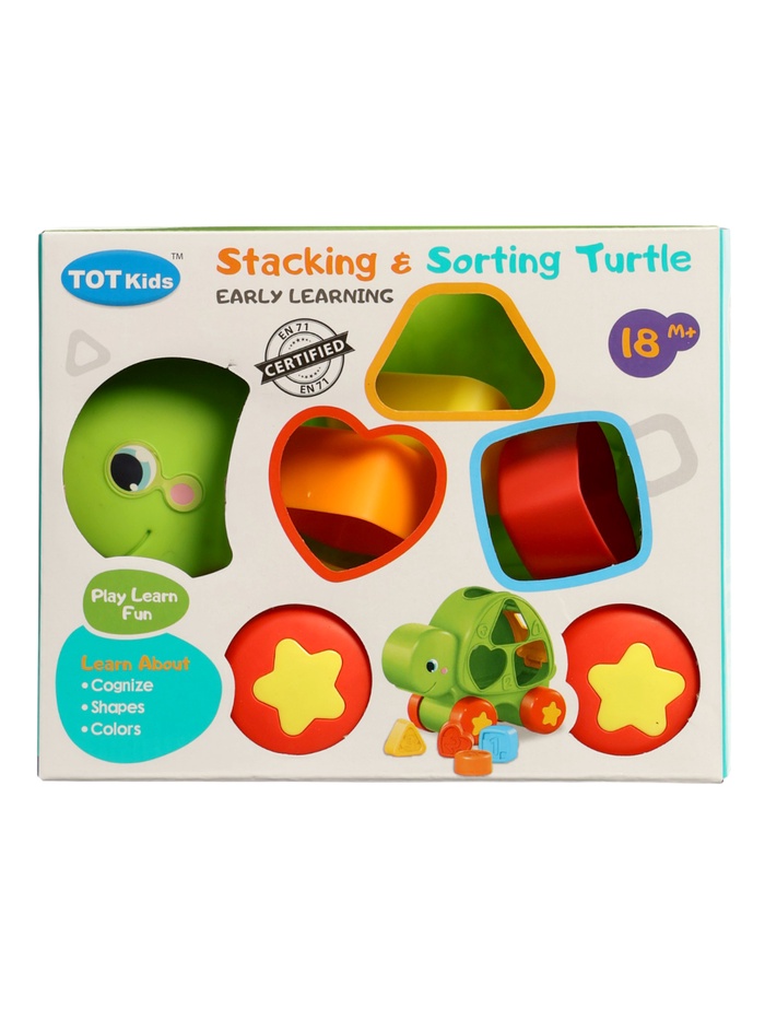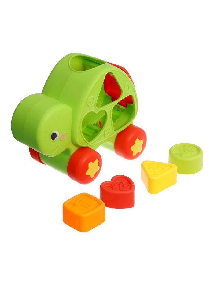 Развивающий сортер «Черепашка» с циферблатом, на колёсиках — яркая игрушка для детей от 18 месяцев. Малыш сортирует фигурки, знакомится с цифрами, тренирует внимание, логику и мелкую моторику. Игрушку можно катать, держать за панцирь, изучать цвета и вращать стрелки на часах — обучение через игру, без скуки.