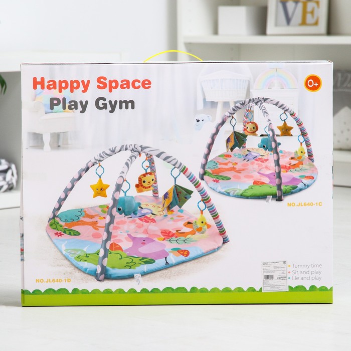 Малыш играет на спинке лёжа. На самом раннем этапе своего развития малыш тянется за яркими, притягивающими внимание игрушками и учится их хватать, так же малыш видит свое отражение в безопасном зеркальце и улыбается. В комплекте с ковриком прилагаются подвесные игрушки, яркие и привлекательные, они служат для развития тактильных ощущений и зрения.