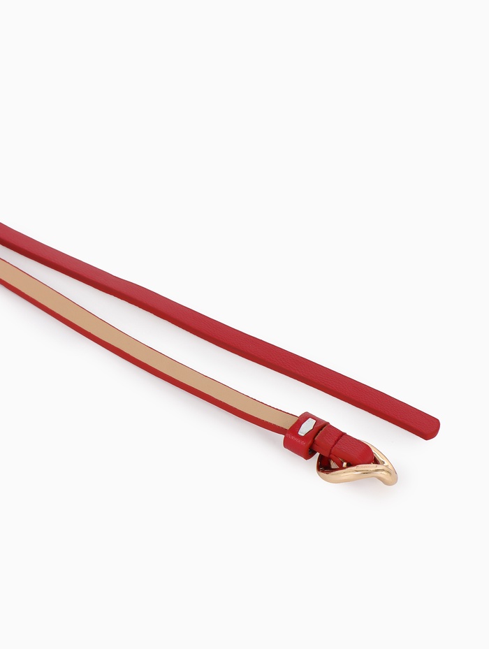 Тонкий красный ремень-затяжка с золотистой фурнитурой создает выразительный акцент на монохромных платьях и туниках. Насыщенный цвет привлекает внимание к линии талии, сохраняя изящество силуэта.