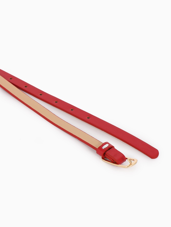 Узкий красный ремень с золотистой пряжкой создает выразительный акцент в монохромных комплектах. Промежуточная ширина сочетает заметность и изящество, дополняя платья, юбки и брюки нейтральных оттенков.