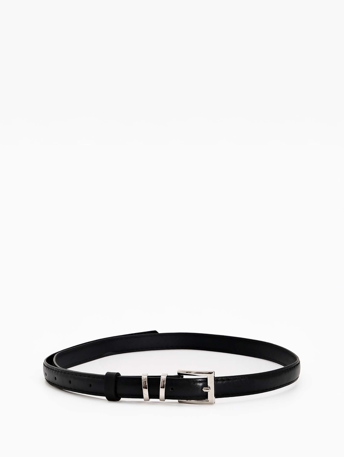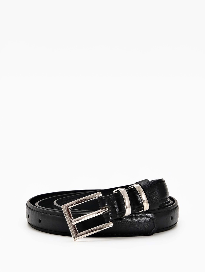 Женский черный ремень с серебряной пряжкой создает строгий и собранный силуэт. Аксессуар подчеркивает талию, сохраняя сдержанную элегантность в деловом и повседневном стиле. Ширина 2 см обеспечивает устойчивое положение и комфорт при ношении.